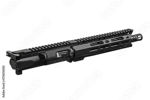 upper, receiver, firearm, gun, rifle, tactical, black, metal, aluminium, assembly, shooting, sport, hunting, defense, weapon, equipment, accessory, rail, muzzle, brake, flash, barrel, modern, technology, studio, shot, white, background, isolated, product, photo, stock, image, nobody, clean, military, police, part