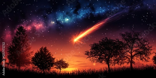 comet, sky, night, tree, star, universe, galaxy, space, cosmic, celestial, shooting, star, meteor, fiery, trail, orange, red, purple, pink, blue, dark, silhouette, landscape, nature, evening, dusk, horizon, sunset, glow, light, bright, amazing, magical, mystical, beautiful, awesome, wonder, picturesque, scenic, vibrant, radiant, dramatic, intense