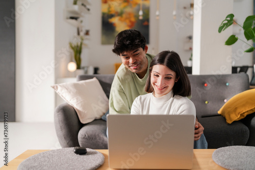 couple, laptop, home, focused, comfortable, casual attire, productivity, sitting, sofa, young, technology, work, leisure, relaxed, indoor, domestic, living room, computing, digital, device, content, lifestyle, modern, enjoyment, concentration, female, candid, single, apartment, design, cheerful, connection, interaction