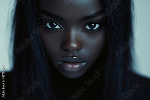 Commercial promotion visual idea. Long trim - highlighted hair. Stunning calm black girl - for ads, banner ad and social media use. Black portrait advertising. Beauty in black models.