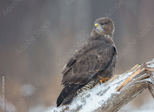 Common Buzzard in winter at a wet forest