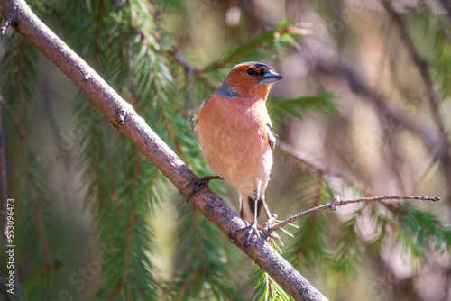 Common chaffinch, Fringilla coelebs, sits on a branch in spring on green background. Common chaffinch in wildlife.