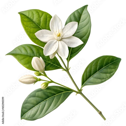 Common Jasmine Classic Fragrant Beauty with Star-Shaped White Blossoms and Glossy Green Foliage Radiating Timeless Elegance on a Pure White Background