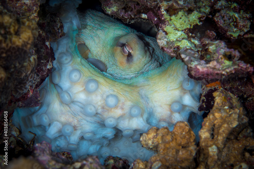 Common octopus peaks out of its hiding hole on coral reef - Octopus vulgaris