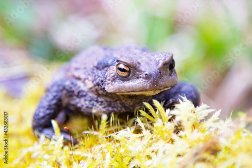 Common toad Bufo bufo at the forest edge. Macro photo. Natural composition