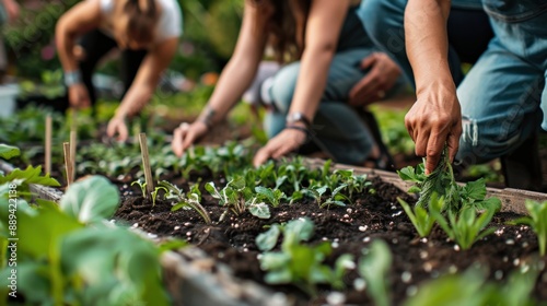 Community garden with people planting and tending to vegetables, showcasing the therapeutic effects of gardening