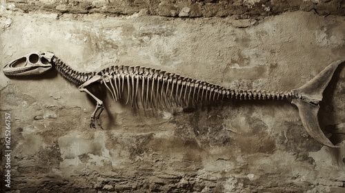 Complete Fossilized Skeleton of Plesiosaur on Display Wall