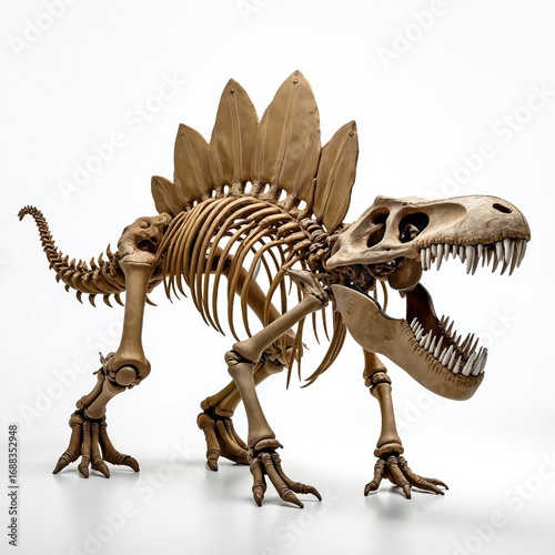 Complete Stegosaurus skeleton fossil in museum display. Ancient reptile skeleton exhibits prehistoric natural history, paleontology science. Detailed bone structure, extinct creature, jurassic era