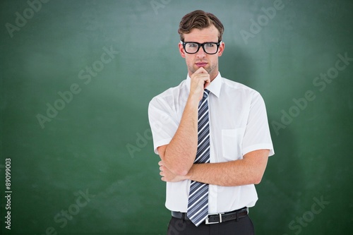 Composite image of serious geeky businessman