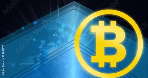 Composition of bitcoin symbol over connections and globe on blue background