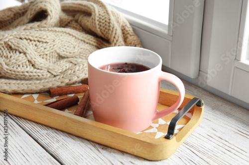 Composition with cup of hot winter drink on sill near window. Cozy season