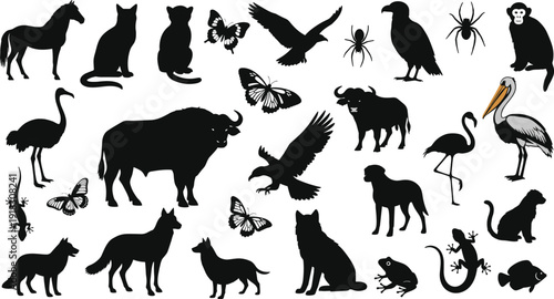 animal, silhouette, wildlife, nature, vector, isolated, black, bird, insect, predator, mammal, pet, collection, fauna, wild animal, white background, graphic design, spider's web, farm animal, isolated on white, black-and-white