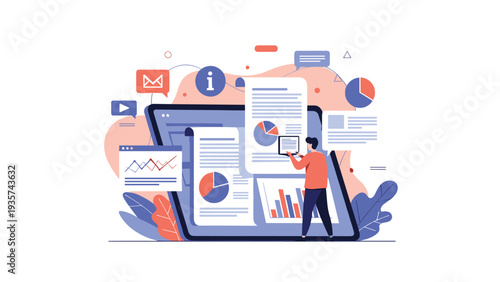 Comprehensive data analysis concept showing a professional interacting with various charts, graphs, and documents displayed on a laptop screen.