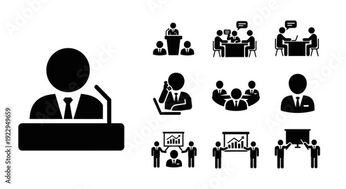 business, meeting, conference, presentation, discussion, collaboration, teamwork, corporate, office, professional, training, workshop, speaker, audience, team, laptop, growth, strategy, communication, management, men at work, employee, executive, graphic, symbol, signs, pictogram, flat, vector, illustration, black, collection, set, success, development, startup, planning, report, chart, idea, innovation, solution