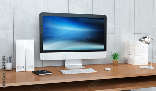 Computer and devices on modern wooden desk interior 3D rendering
