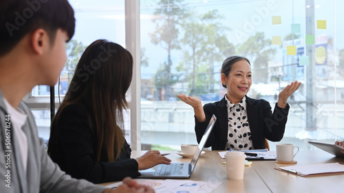 Concentrated middle aged female team leader explaining project details to young employees at meeting