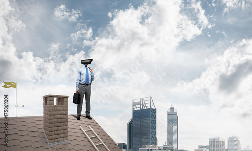 camera, head, zoom, businessman, control, private, cctv, cyberspace, house, roof, brick, suitcase, home, city, city landscape, floor, wooden, crossed, arm, banker, bank, security, protection, technology, manager, management, privacy, personal, lens, man, ability, looking, male, objective, person, picture, profession, business, concept, corporate, electronic, equipment, guard, information, object, people