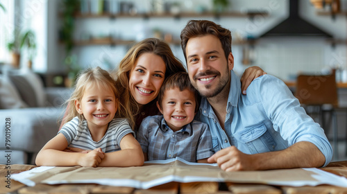 Concept of housing and relocation. happy family mother father and kids with roof at home .