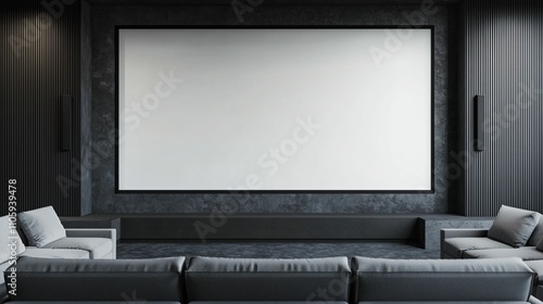 Concept of leisure, entertainment, cinema and theater room. Modern home cinema with a large screen and comfortable seating.