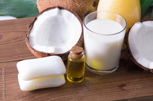 concept of spa and body treatments. coconut oil, coconut milk, soaps and bath salts