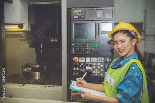 Concept of the talent of a mechanic working woman : Female technicians in the factory producing machine parts, automatic lathe inspection