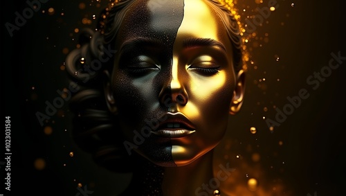 conceptual, digital, artwork, woman, face, metallic, substance, gold, black, contrast, visual, luxury, royalty, mystery, depth, gleaming, matte, droplet, cascading, symmetry, duality, texture, abstract, beauty, design, elegance, shine, fusion, modern, surreal, fashion, model, make-up, art, make-up, hair, glamour, lip, lady, person, mask, eye, skin, sensuality, head, closeup, style, expression