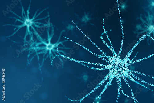 Conceptual illustration of neuron cells with glowing link knots. Synapse and neuron cells sending electrical chemical signals. Neuron of Interconnected neurons with electrical pulses, 3D illustration