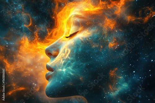 Conceptual Soul Fire and Space, Ethereal Double Exposure Portrait, Dreamy Bokeh, Person Face, Dream Avatar, Mental Health Concept Backdrop, State of Mind Concept Art