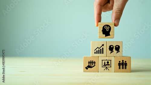 Conceptualizing Growth and Learning Hand Stacking Blocks with Icons Representing Ideas, Progress, and Collaboration