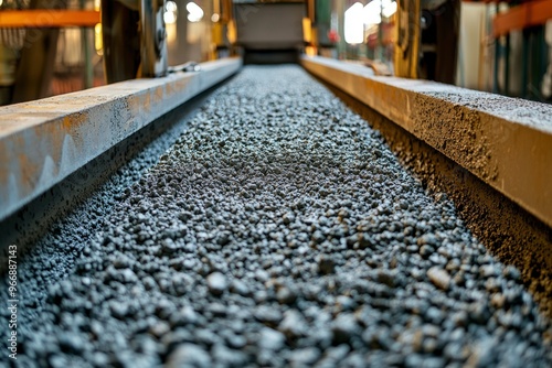concrete, aggregate, gravel, conveyer, belt, machine, factory, production, construction, industry, material, manufacturing, building, industrial, process, transportation, movement, flow, metal, steel, grey, brown, texture, rough, surface, detail, background, abstract, pattern, granular, coarse, stone, pebble, machinery, automation, engineering, technology