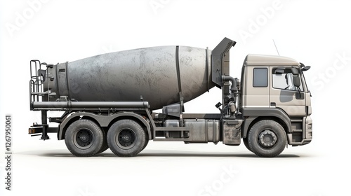 Concrete mixer truck with a rotating drum, isolated on a white background.