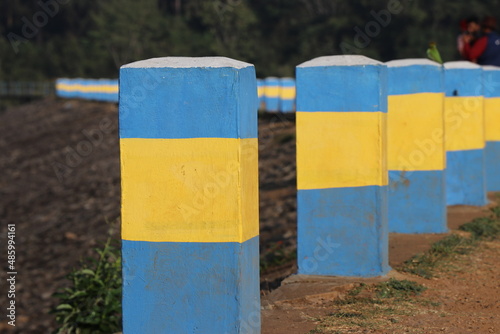 concrete pivots painted in blue and yellow to delimit parking areas on the side of dam. Road barriers for safety