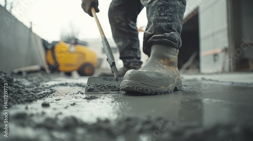 Concrete worker smoothing a concrete surface with a trowel. Featuring precision and focus
