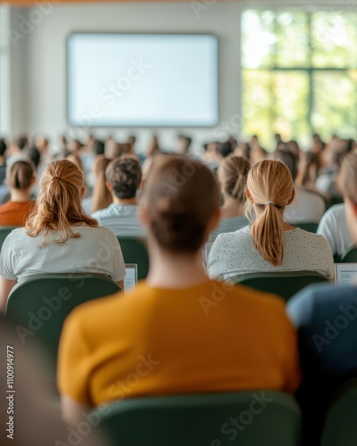 conference, hall, audience, education, business, symposium, presentation, lecture, seminar, workshop, training, student, people, crowd, classroom, university, college, school, learning, meeting, event, gathering, group, backview, modern, interior, bright, window, panoramic, blurred background, speaker, screen, chair, sitting, listening, educational