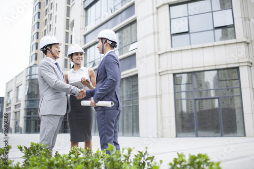 architect, chinese, asian, construction, handshake, cooperation, architecture, talking, engineer, construction site, building, blueprint, cheerful, confidence, building exterior, city landscape, urban scene, business, businessperson, businessman, businesswoman, manager, occupation, office worker, professional occupation, teamwork, team, leadership, designer, people, three people, missy, woman, female, man, male, asian ethnicity, adult, adults only, young adult, mature adult, hard hat, development, engineering, quality control, safety, protection, close to, enjoyment, happiness, joy, lifestyle, modern, partnership, skill, strategy, togetherness, wisdom, technology, wireless technology, suit, attaching, full suit, well-dressed, skirt, fashion, authority, city, city life, day, outdoors, skyscraper, facades, discussion, face to face, holding, looking away, smiling, standing, toothy smile, working, china, east asia, asia, photo, color image, front view, selective focus, horizontal