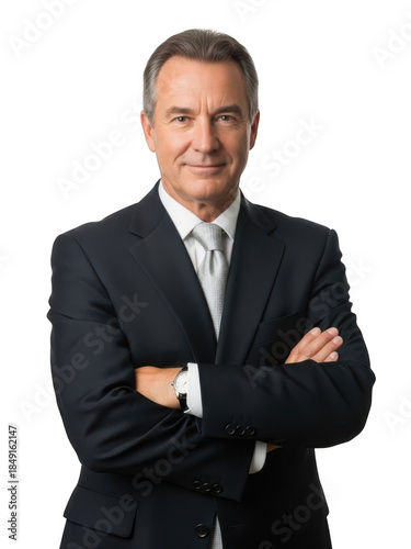 man, suit, business, formal, grey hair, attaching, confident, white background, composed, arms crossed, dress shirt
