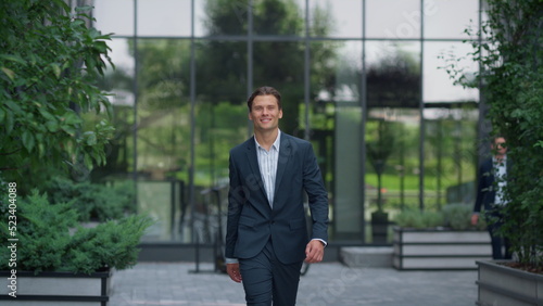 Confident businessman walking downtown complex in suit. Successful entrepreneur