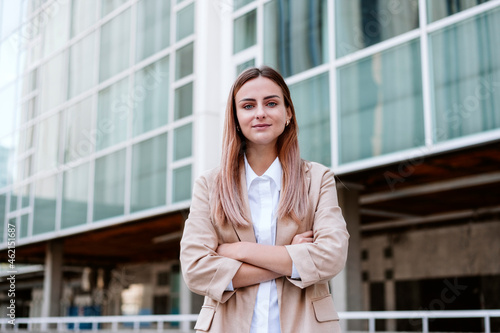 confident, businesswoman, standing, arm, crossed, smiling, copy space, 1, people, adult, business, woman, outdoors, day, spain, occupation, job, exterior, building, architecture, young, blond, confidence, city, caucasian, long hair, hair, blazer, jacket, female