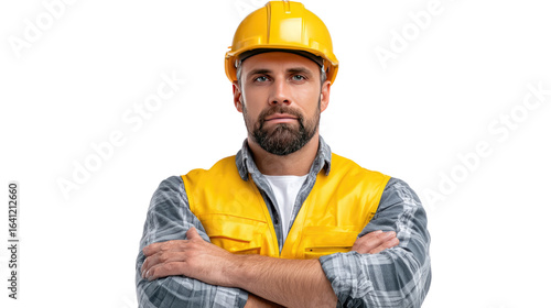 Confident Construction Worker: A construction worker stands confidently, his expression exuding experience and focus while sporting a yellow safety helmet and vest, epitomizing expertise and safety.