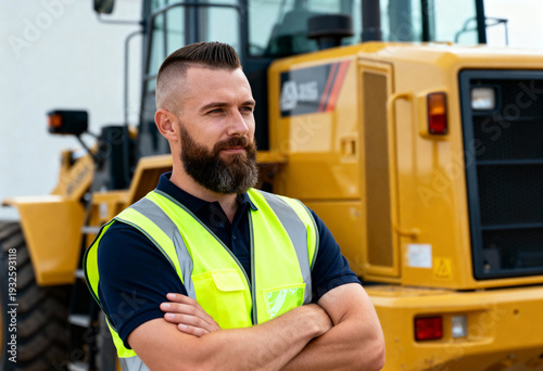 men at work, construction, man, operator, heavy equipment, machinery, industrial, safety, vest, professional, industry, job, foreman, engineer, builder, contractor, employee, person, male, adult, caucasian, portrait, uniform, reflective, gear, safety-gear, construction site, building site, heavy machinery, earthmover, bulldozer, tractor, vehicle, transportation, logistic, warehouse, factory, occupation, career, leadership, expert, blue-collar, confident, arms crossed, outdoors