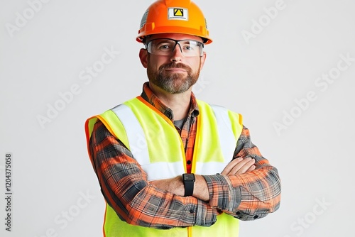construction, men at work, portrait, professional, hard, hat, safety, gear, industrial, building, site, engineer, man, confident, strong, vest, arm, job, helmet, goggles, goggles, plaid, shirt, crossed, serious, expression, studio, background, isolated, occupation, trade, industry, labor, skilled, contractor, technician, supervisor, career, employment, team, project, architecture, design, infrastructure
