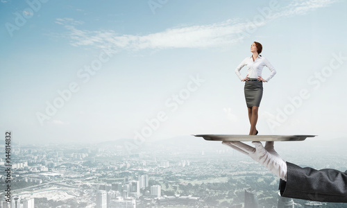 Confident elegant businesswoman presented on metal tray against cityscape background