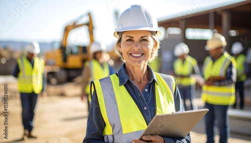 woman, construction, men at work, smile, confident, site, tablet, safety, equipment, focused, professional, hard hat, vest, teamwork, project, industry, building, engineer, foreman, leader, active, bright, sunny, day, dirt, machine, people, group, background, checklist, planning, success, female, leadership, positive, skilled