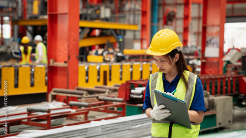 industrial, men at work, female, woman, factory, helmet, safety, vest, clipboard, inspection, quality, control, engineer, professional, workplace, construction, steel, metal, sheet, production, manufacturing, teamwork, business, management, confident, supervisor, staff, operator, technology, process, plant, training, monitoring, occupational, development, equipment, structure, fabrication, design, project, assembly, leadership, industry, engineering, precision, modern