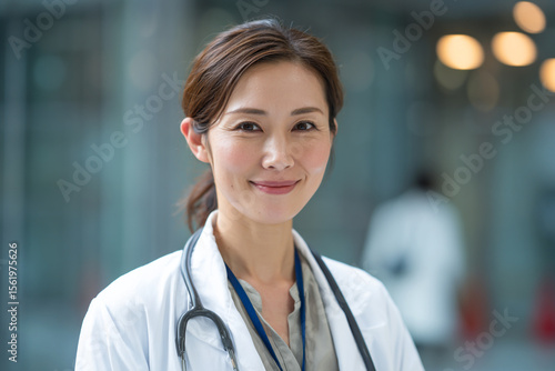 Confident Japanese female doctor wearing a white coat and stethoscope, smiling with assurance in a modern hospital background.