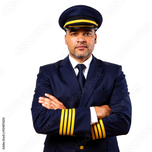 pilot, male, uniform, airline, confident, professional, white background, aviation, captain, leader, career, transportation, travel, responsibility, authority, hat, experienced, inclusive, sharpened, dedication, expertise, occupation, success, inspiring, strong, discipline, multicultural, job, industry, determination, trustworthy, accurateness, precise, modern, corporate, skilful, leadership, self-assured, teamwork, competence