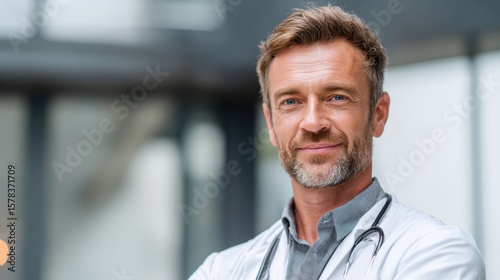 Confident male doctor standing in a modern healthcare setting, smiling at the camera with professionalism.