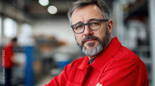 Confident Male Worker in Red Jacket with Glasses in Industrial Setting