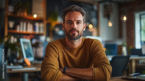 man, confident, office, workspace, modern, professional, sitting, desk, arm, crossed, sweater, mustard, yellow, beard, serious, expression, gaze, eye, hair, stylish, businessman, entrepreneur, designer, men at work, employee, mature, adult, background, blurred, lighting, warm, comfortable, relaxed, calm, focused, thoughtful, indoor, room, furniture, technology, computer, screen, bookshelf, book, plant, successful, portrait, image