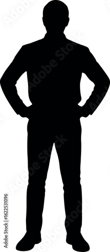 silhouette, man, standing, confident, hand, on, hip, full, body, isolated, white, background, male, person, figure, outline, dark, black, simple, minimalist, business, professional, power, strength, leadership, success, posed, studio, shot, profile, icon, graphic, design, element